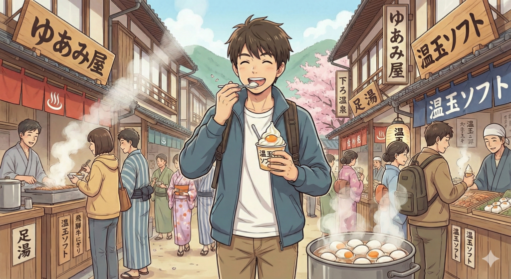 - ゆあみ屋の「温玉ソフト」 温泉卵とソフトクリームを混ぜて食べる、下呂温泉の名物スイーツ。濃厚なカスタードクリームのような味わいは、ここでしか食べられません。