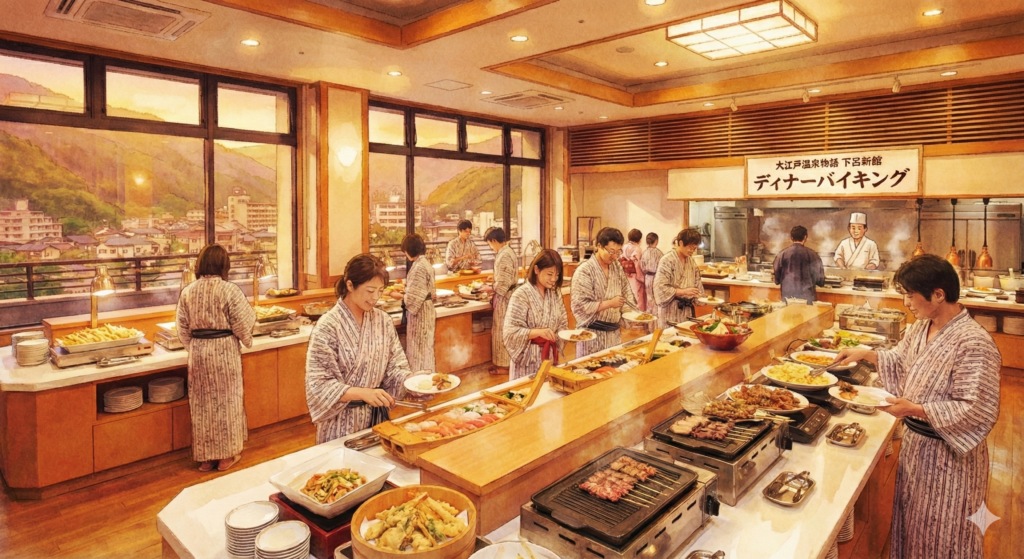 - 大江戸温泉物語などの「バイキング形式」の宿 どうしても宿でご飯が食べたいなら、大型チェーンの温泉宿が圧倒的にコスパ良し。朝夕バイキング付きで1万円前後のプランが見つかることも。